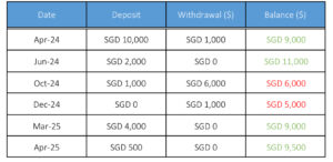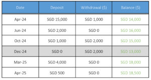 - Key Observations: In December 2024, another withdrawal of SGD 2,000 lowers the balance to SGD 13,000, which is the lowest balance during the lunar year.