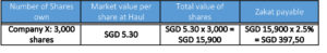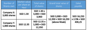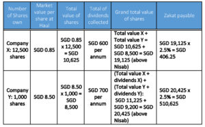 2.5% × 15,000 = SGD 375 - Dividends must be included in the total Zakat calculation. If the investment generates dividends that reach the Nisab and are held for one Haul, these dividends should also be added and Zakat paid on them. Please see the table below:
