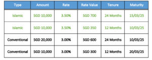 - Zakat Calculation: Total Zakatable amount = SGD 51,050 (this includes all matured amounts that meet or exceed the Nisab)